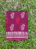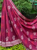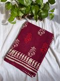 Block printed mul cotton saree in maroon shade with big buttas all over. Perfect office wear or for a casual drape