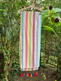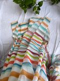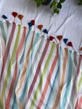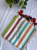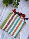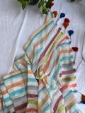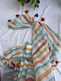White bengal mul cotton saree with pastel tone horizontal lines running end to end. Dreamy, classy and elegant